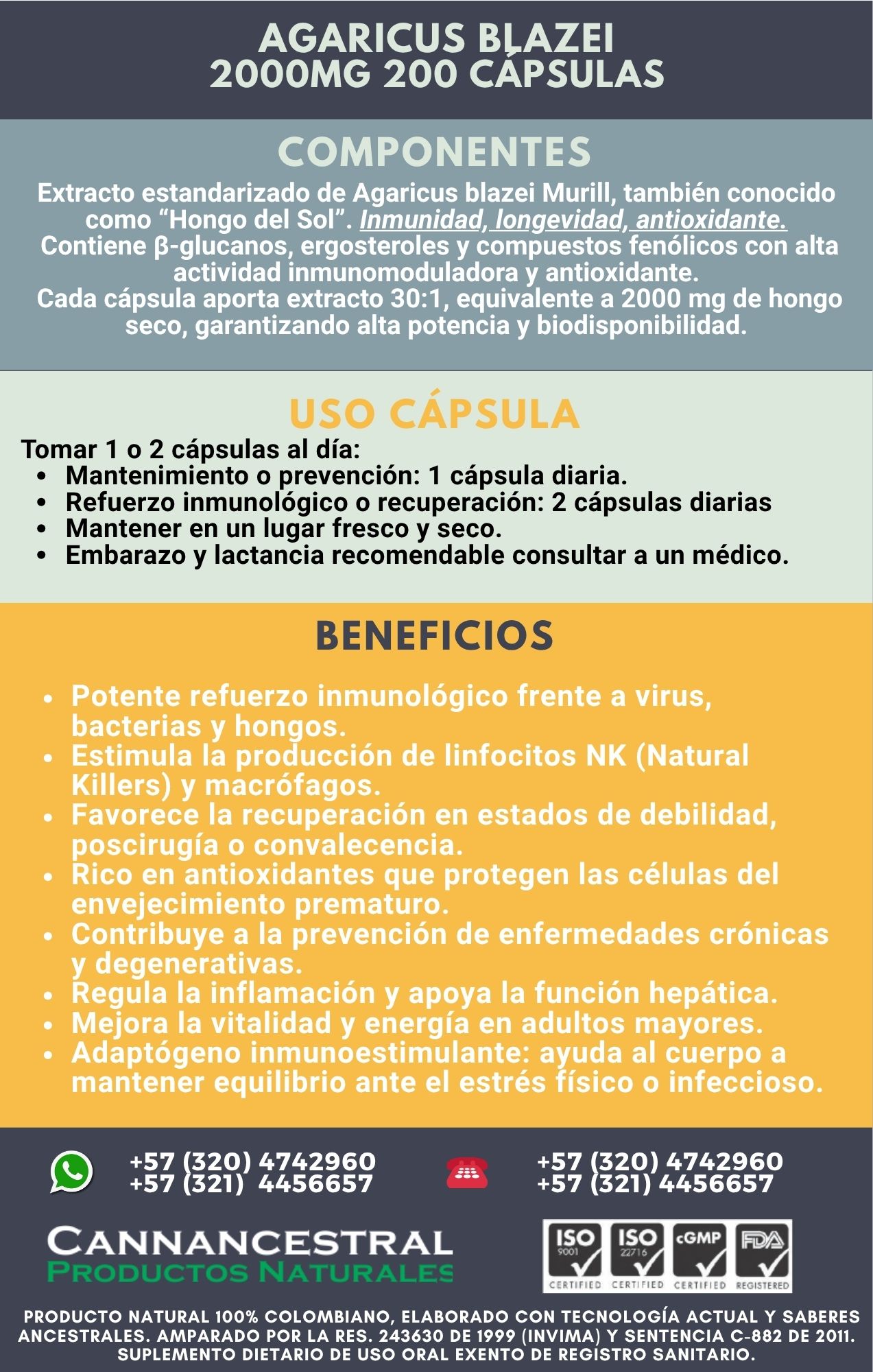 No esperes más para fortalecer tu salud de manera natural. ¡Compra ahora AGARICUS BLAZEI 2000MG 200 CÁPSULAS y potencia tu sistema inmunológico con el poder del “Hongo del Sol”! Tu cuerpo y mente te lo agradecerán.