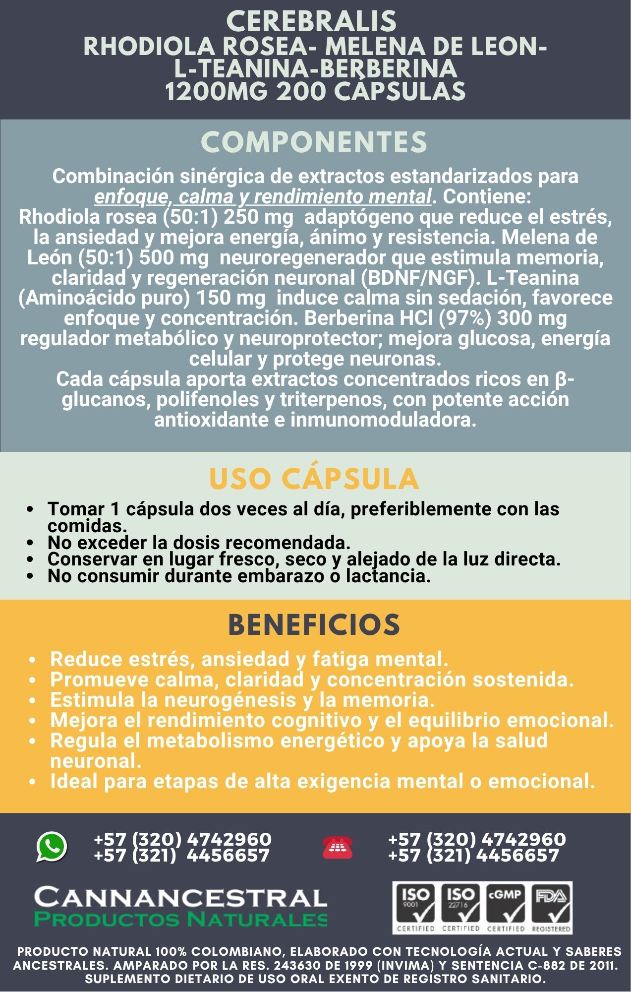 No dejes que el estrés o la fatiga te detengan. Compra ahora CEREBRALIS 1200MG 200 CÁPSULAS y transforma tu rendimiento mental y emocional. ¡Tu cerebro merece lo mejor!