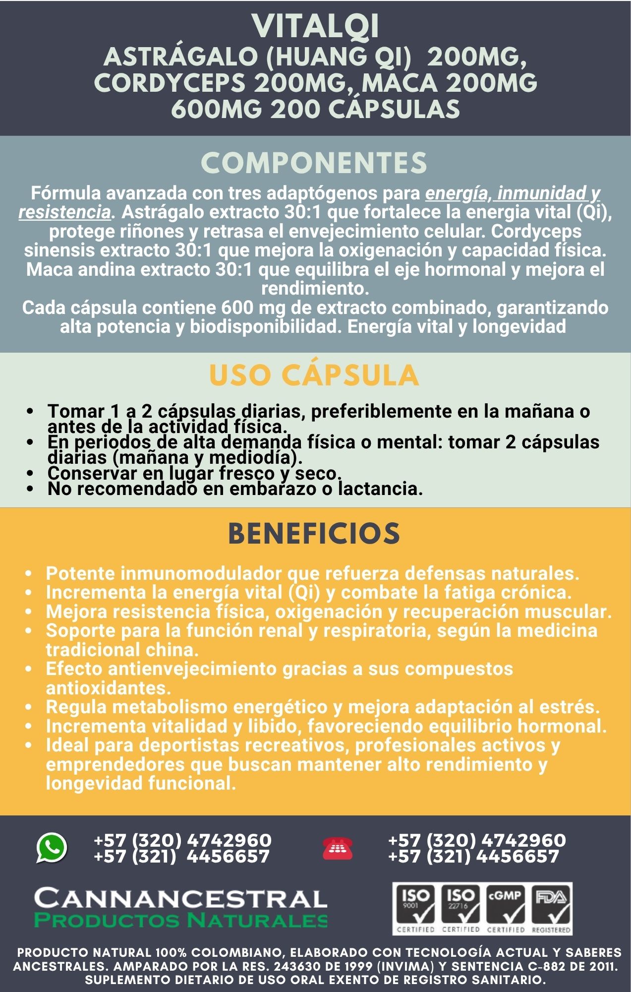 ¡Potencia tu energía y bienestar con VITAL QI 600MG 200 CÁPSULAS! Esta fórmula avanzada combina tres poderosos adaptógenos para ofrecerte un soporte integral en energía, inmunidad y resistencia física, ideal para quienes buscan mantener un alto rendimiento y longevidad funcional.